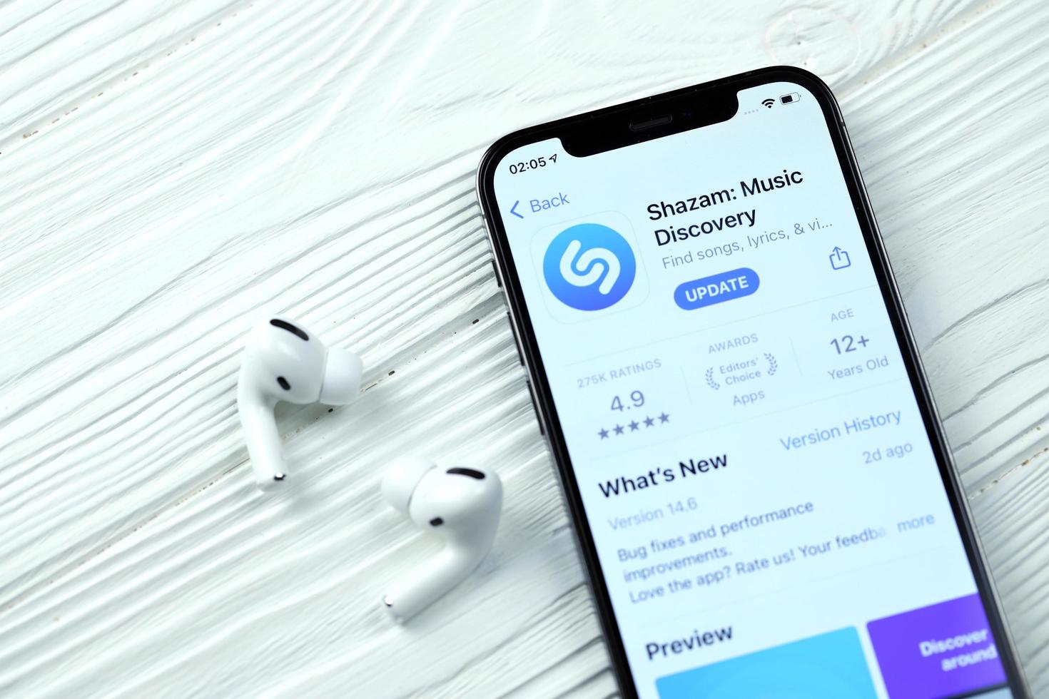 KHARKOV. UKRAINE - MAY 2, 2022 Shazam icon and application from App store on iPhone 12 pro display screen with airpods pro on white table