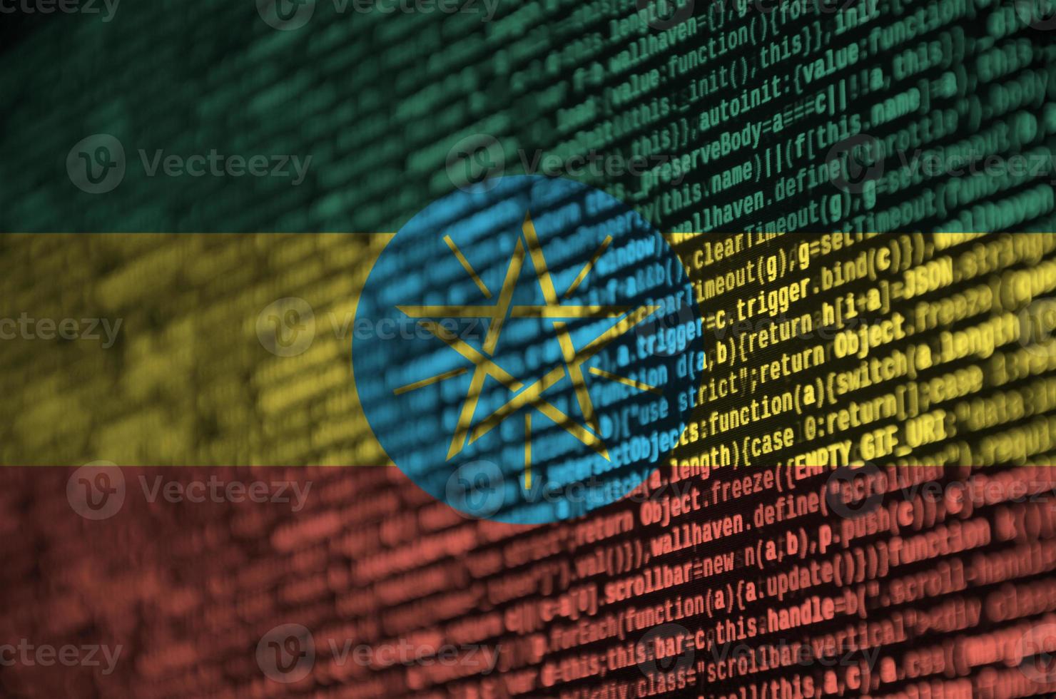 Ethiopia flag is depicted on the screen with the program code. The concept of modern technology and site development Pro Photo