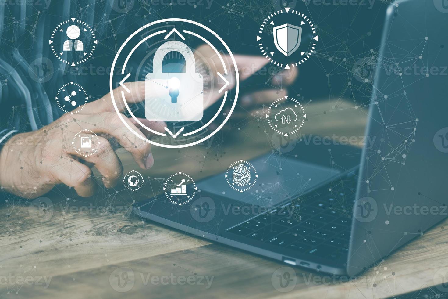 cyber security concept Man's hand using a smartphone showing a padlock icon to show that the smartphone is protected from hackers from hacking, logging in. online trading or use of social media Pro Photo