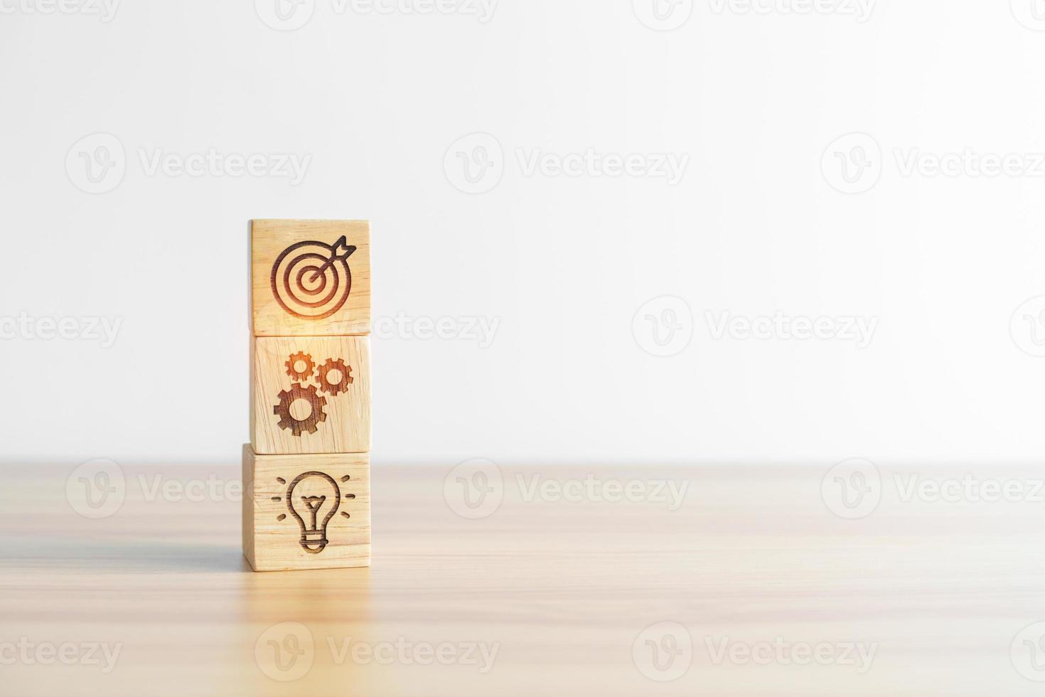 dartboard above Gear and Lightbulb icon block on desk. business planning process, goal, strategy, target, mission, action, objective, teamwork and idea concept Pro Photo