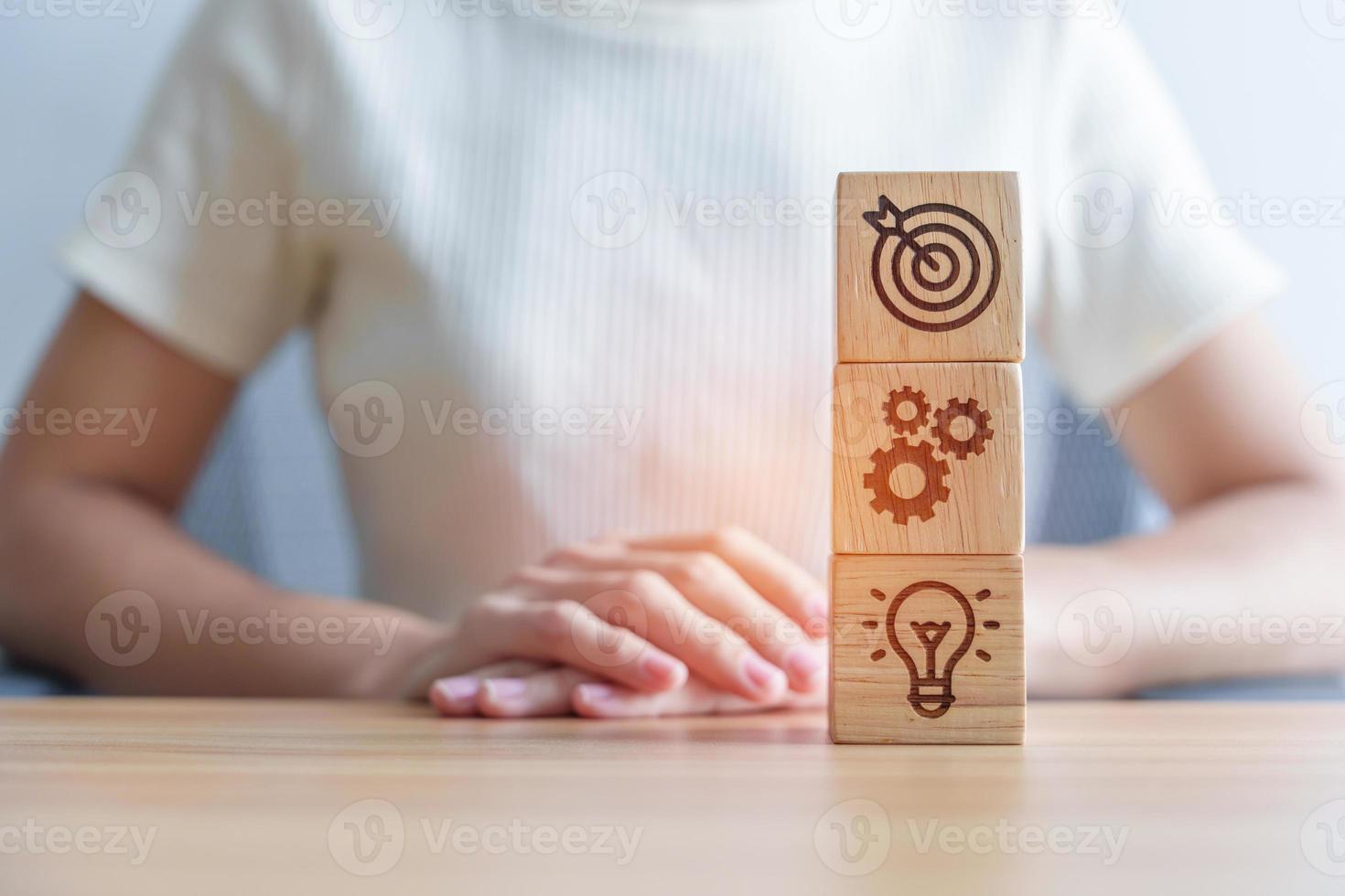 dartboard above Gear and Lightbulb icon block on desk. business planning process, goal, strategy, target, mission, action, objective, teamwork and idea concept Pro Photo