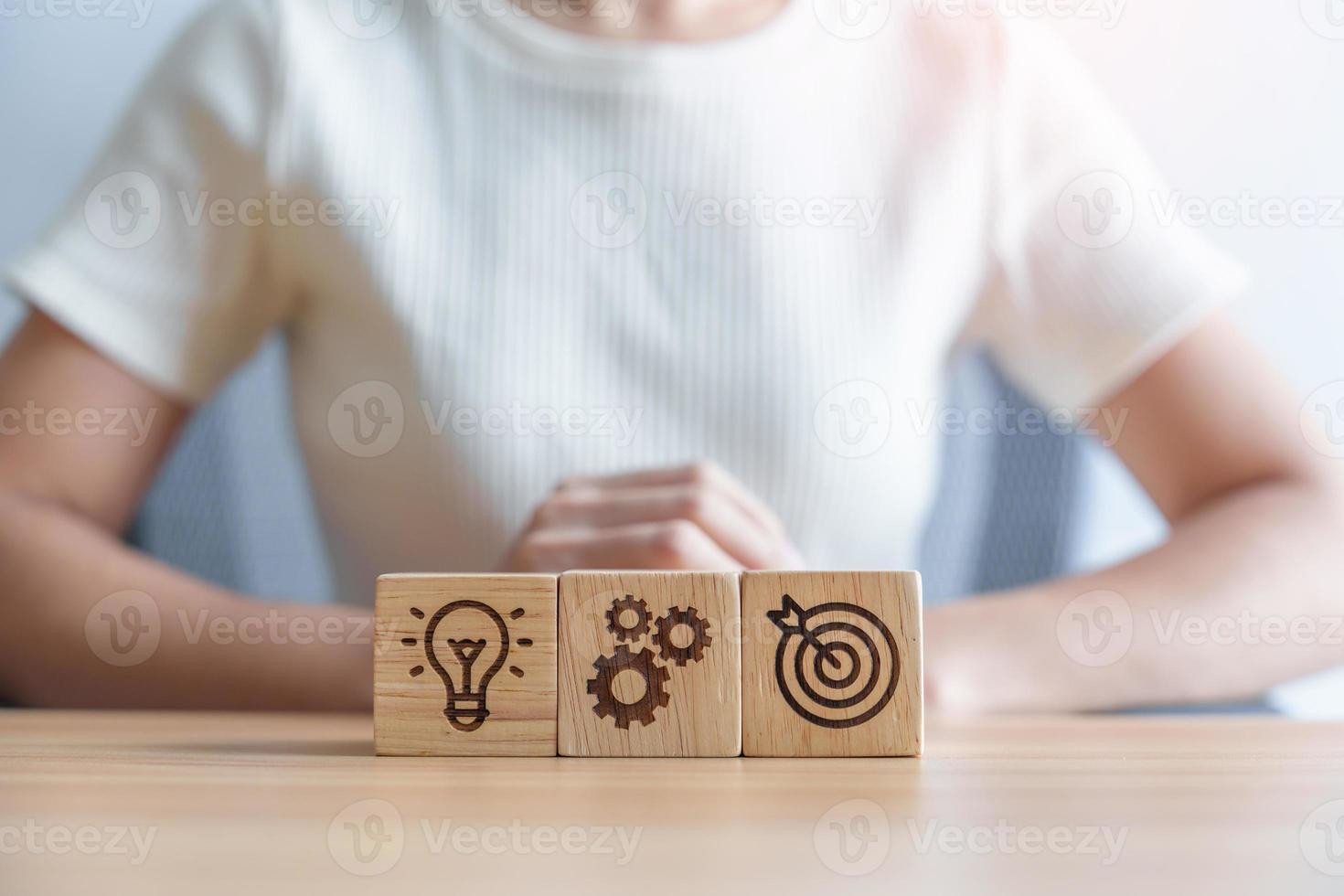 dartboard above Gear and Lightbulb icon block on desk. business planning process, goal, strategy, target, mission, action, objective, teamwork and idea concept Pro Photo