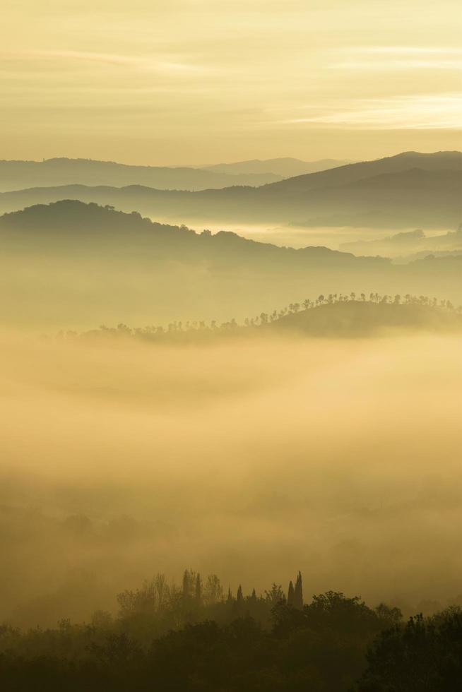 Trees and hill surrounded by fogs under hazy clouds Free Photo