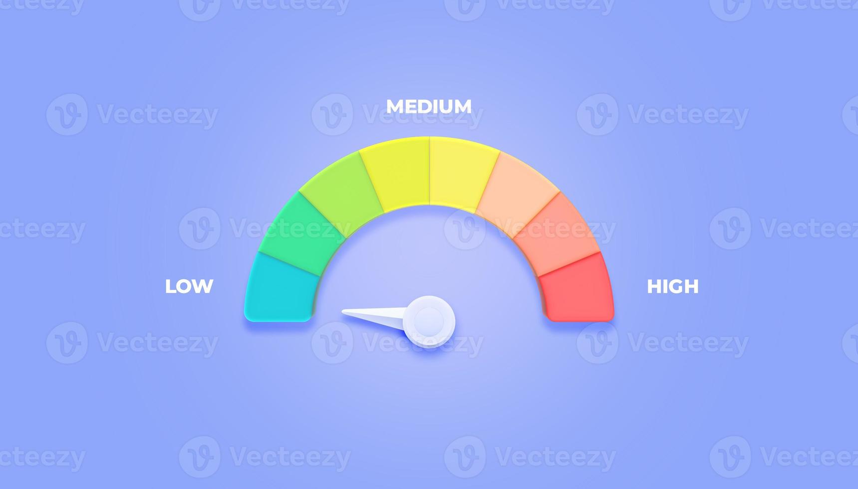 Risk Management, Arrow point scale speed low status green speedometer icon Performance, pointer rating risk levels, meter, tachometer on purple background. Pro Photo