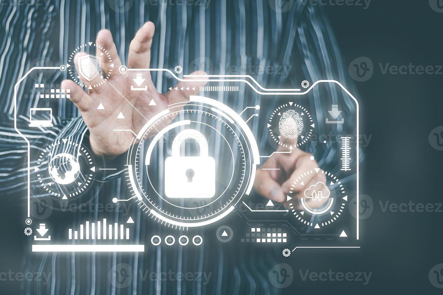cyber security concept Man's hand using a smartphone showing a padlock icon to show that the smartphone is protected from hackers from hacking, logging in. online trading or use of social media Pro Photo