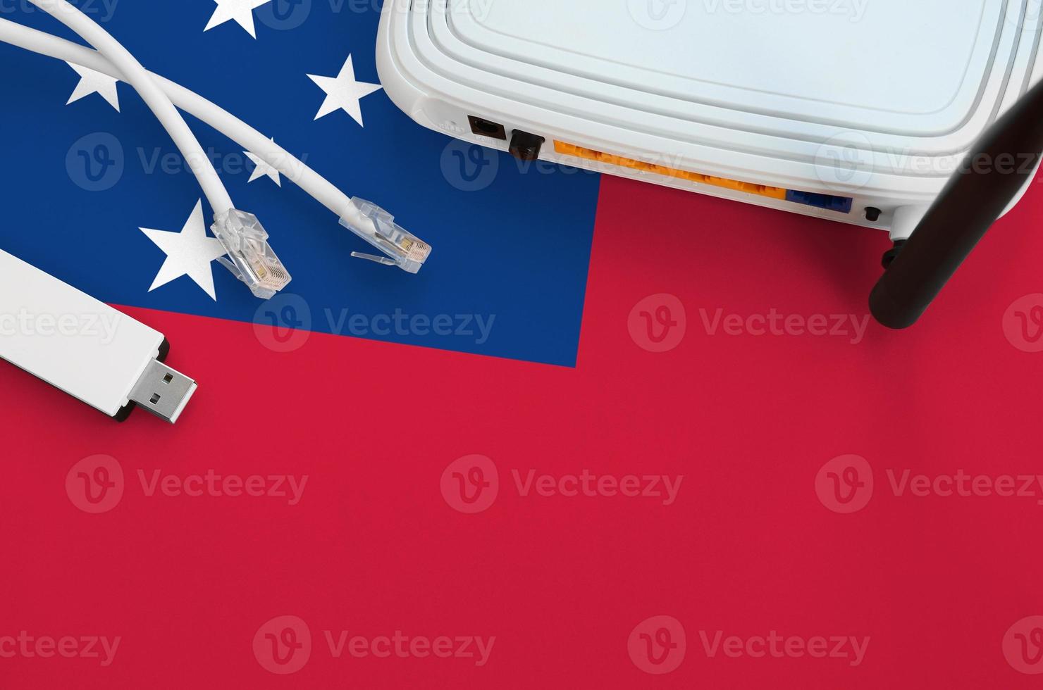 Samoa flag depicted on table with internet rj45 cable, wireless usb wifi adapter and router. Internet connection concept Pro Photo