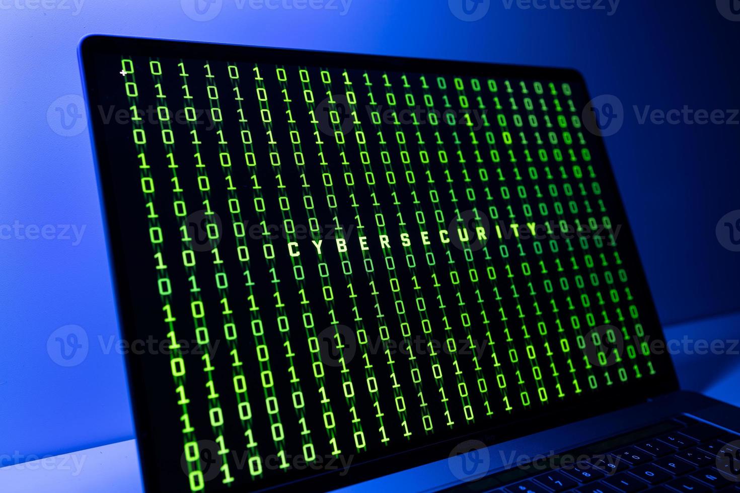 Cybersecurity concept. Laptop screen with cibersecurity word and binary code background Pro Photo