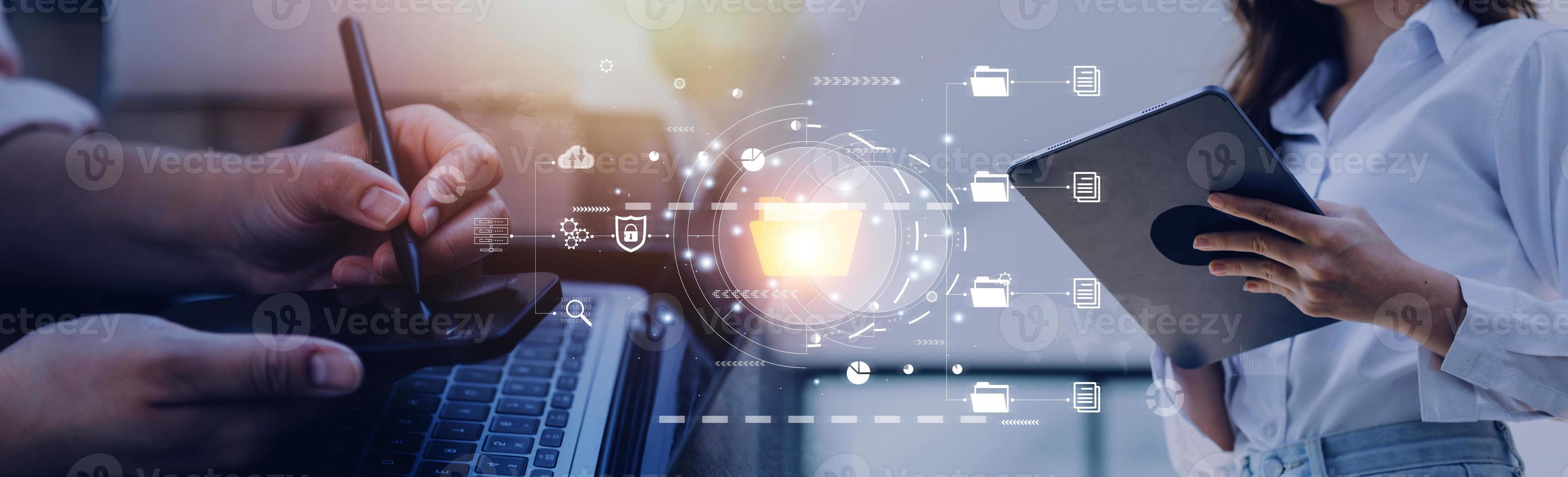 Document management system concept, Businessman signs electronic documents on digital documents, searching and managing files online document database, for efficient archiving and company data Pro Photo