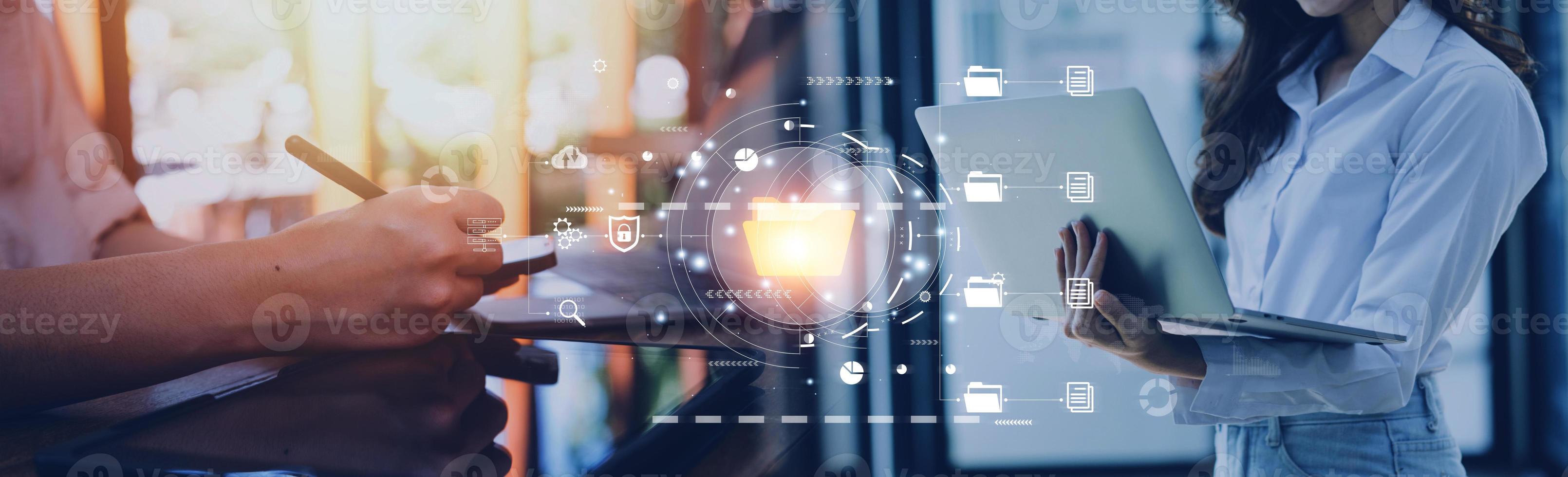 Document management system concept, Businessman signs electronic documents on digital documents, searching and managing files online document database, for efficient archiving and company data Pro Photo