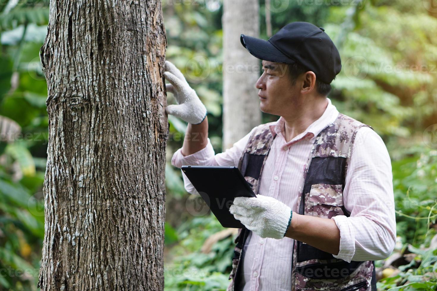 Asian male botanist survey and collect information of botanical plants by using smart tablet. Concept, using smart device technology to manage environment and research trees. Pro Photo