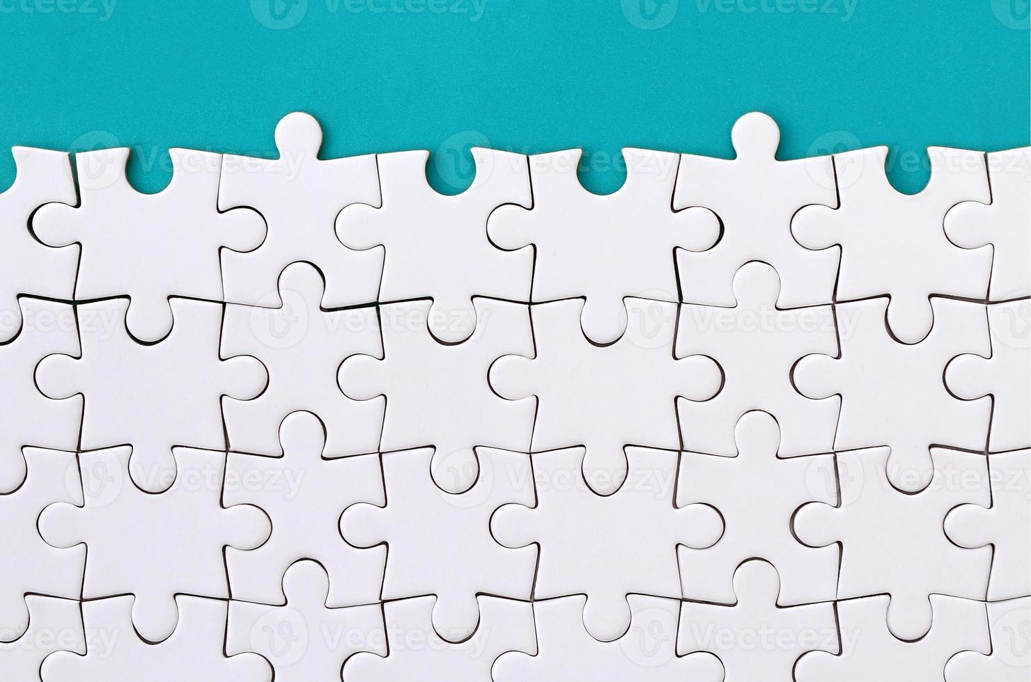 Fragment of a folded white jigsaw puzzle on the background of a blue plastic surface. Texture photo with copy space for text Pro Photo