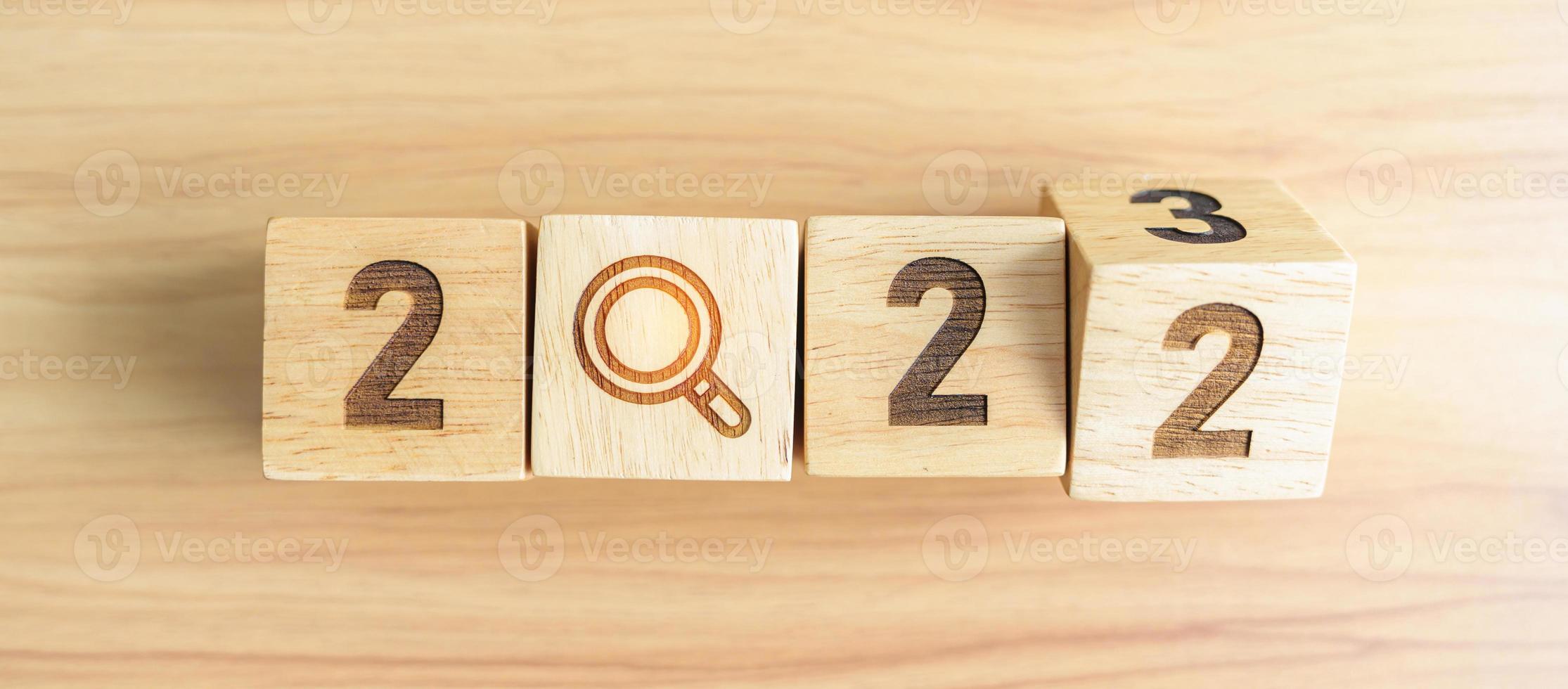 2022 change to 2023 block with magnifying glass icon. SEO, Search Engine Optimization, hiring , Advertising, Idea, Strategy, marketing, Keyword, Content and New Year start concepts Pro Photo