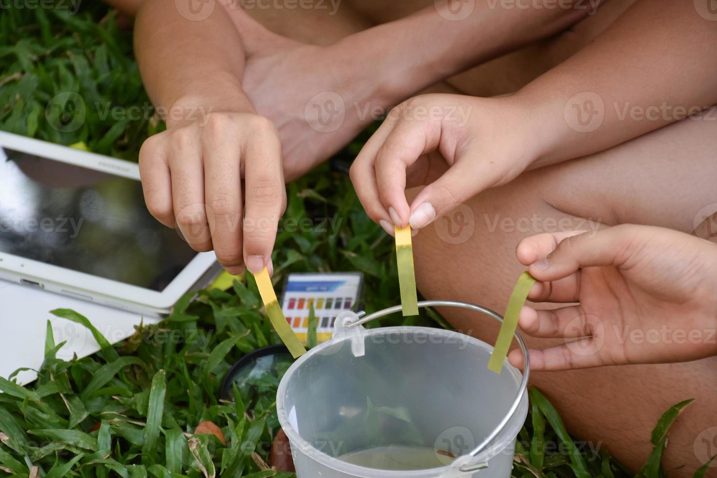 Students are experimenting and measuring the pH of water or the acidity and alkalinity of water to determine whether it is suitable for living organisms or can it be consumed by using indicator paper. Pro Photo