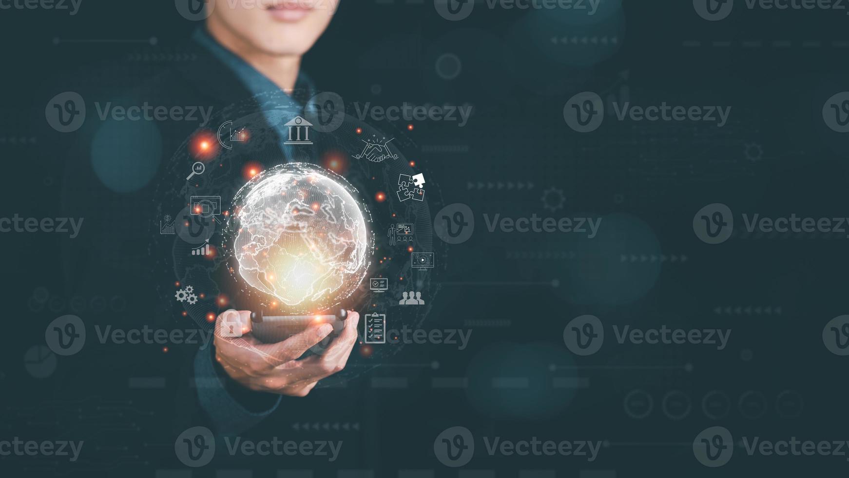 Businessman holding smartphone and virtual icons,cyberspace network connection concept,and digital communication with a large database,big data,Business analytics with modern technology Pro Photo