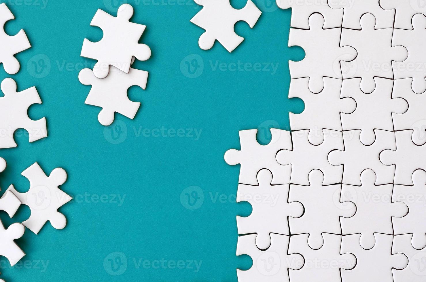 Fragment of a folded white jigsaw puzzle and a pile of uncombed puzzle elements against the background of a blue surface. Texture photo with space for text Pro Photo
