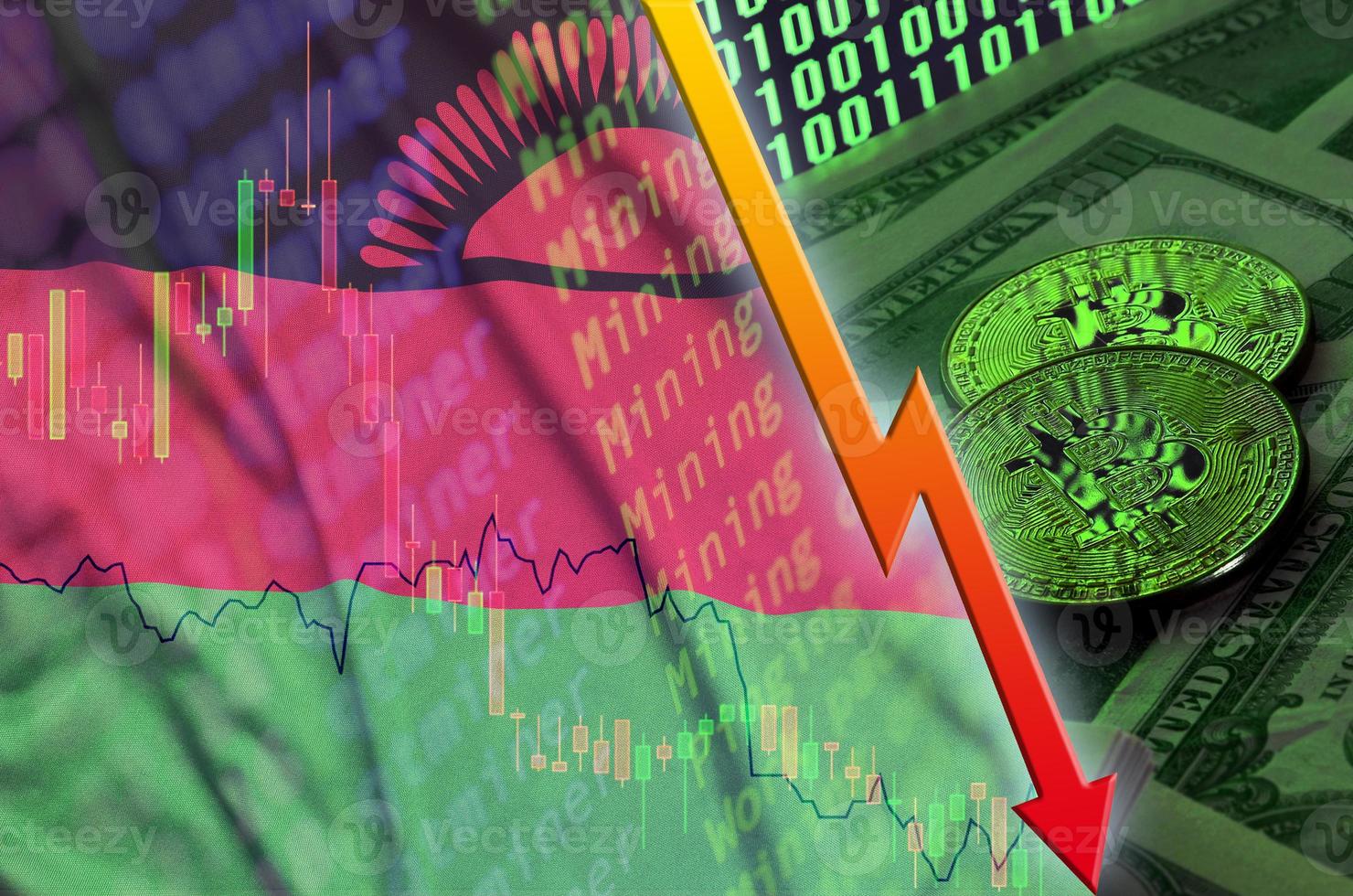 Malawi flag and cryptocurrency falling trend with two bitcoins on dollar bills and binary code display Pro Photo