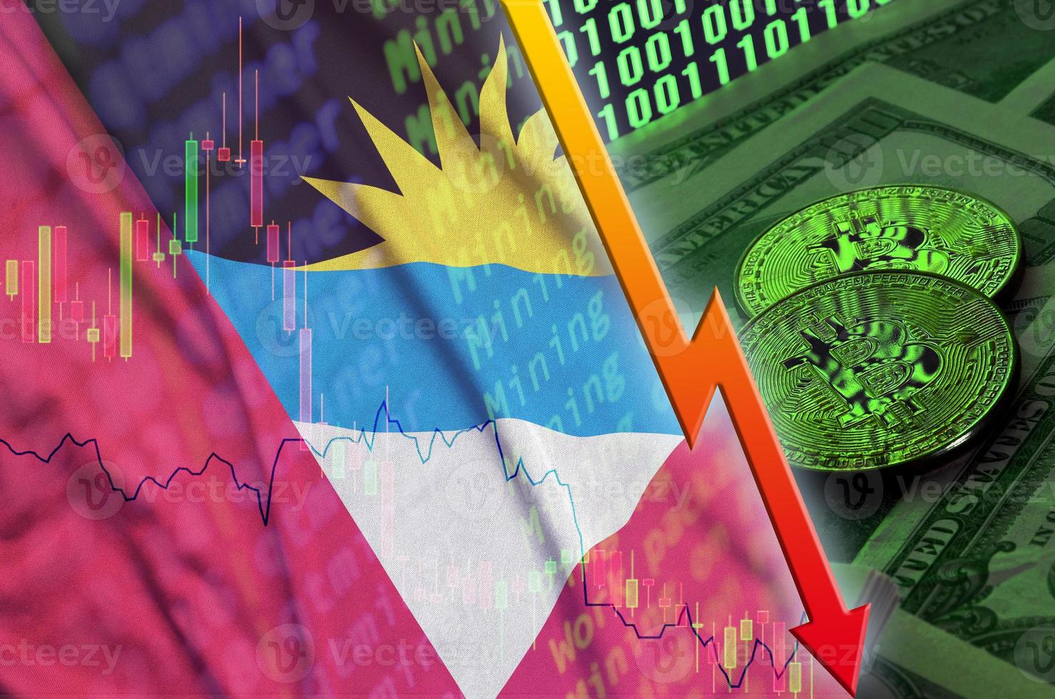 Antigua and Barbuda flag and cryptocurrency falling trend with two bitcoins on dollar bills and binary code display Pro Photo