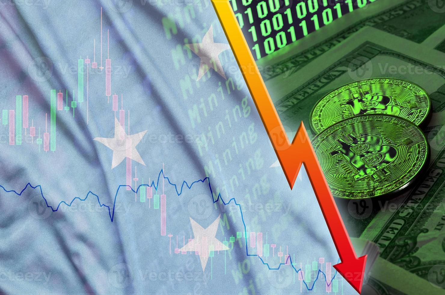 Micronesia flag and cryptocurrency falling trend with two bitcoins on dollar bills and binary code display Pro Photo
