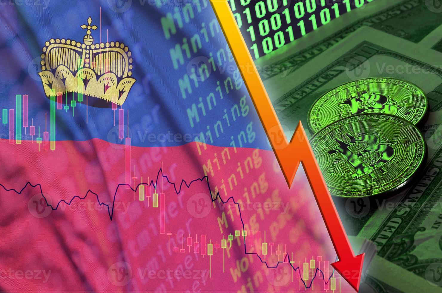 Liechtenstein flag and cryptocurrency falling trend with two bitcoins on dollar bills and binary code display Pro Photo