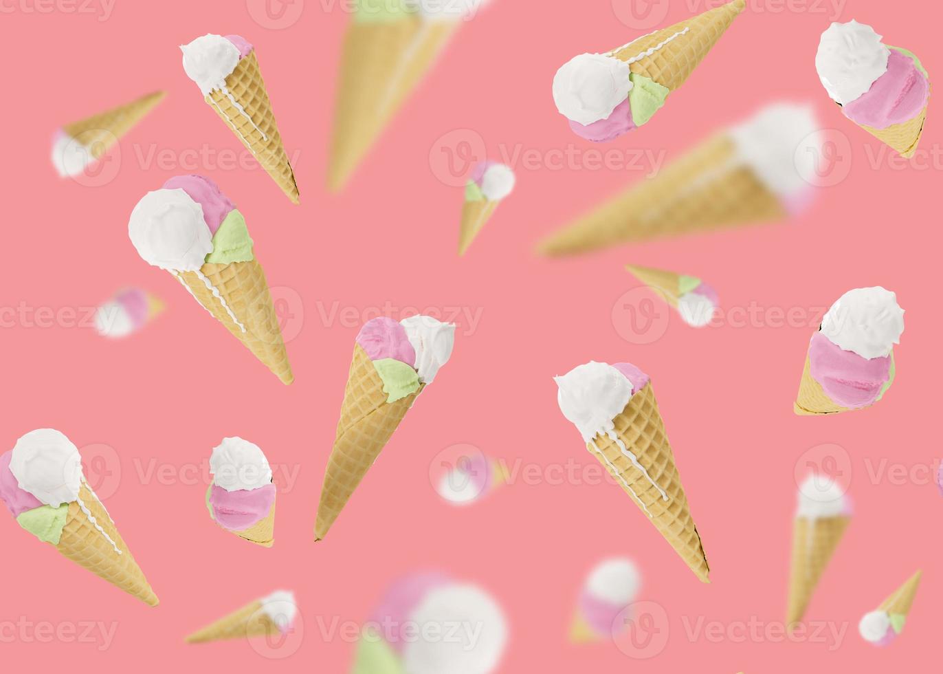 Seamless pattern with ice cream on pink background. Colorful summer background, texture. Eye-catching design. 3d rendering. Pro Photo