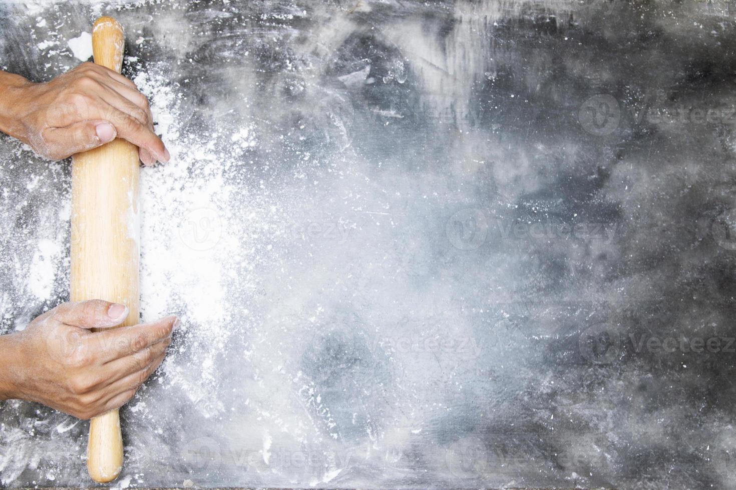young hands keep mashed rolling pin with thresh flour on the dark black table, Bakery background with the rolling pin with dough. empty space for text . Top view Pro Photo