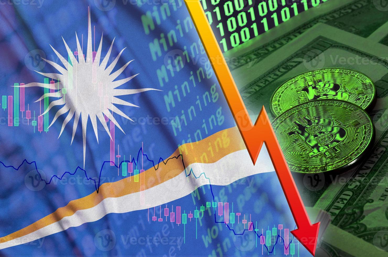 Marshall Islands flag and cryptocurrency falling trend with two bitcoins on dollar bills and binary code display Pro Photo