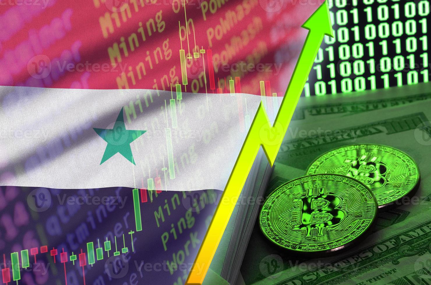Syria flag and cryptocurrency growing trend with two bitcoins on dollar bills and binary code display Pro Photo