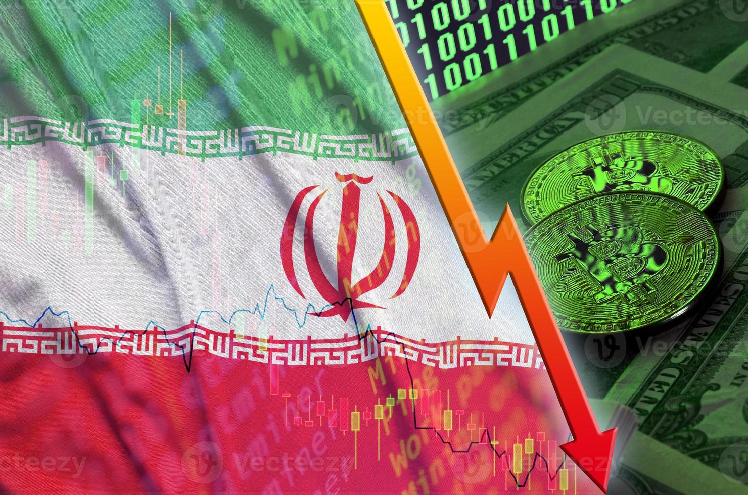 Iran flag and cryptocurrency falling trend with two bitcoins on dollar bills and binary code display Pro Photo