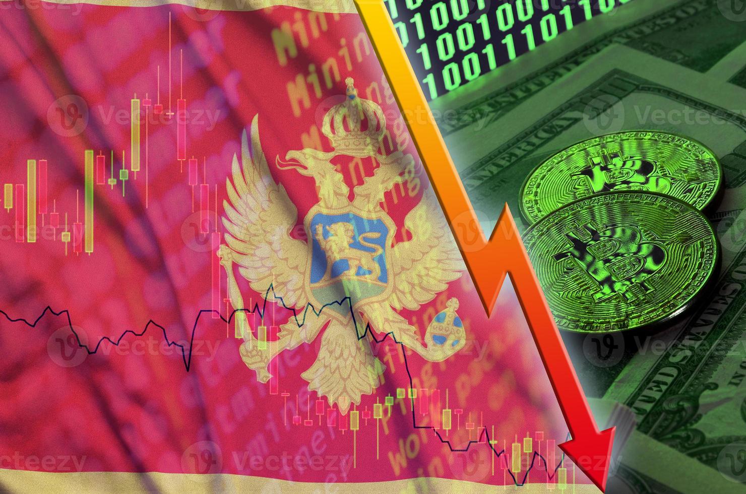 Montenegro flag and cryptocurrency falling trend with two bitcoins on dollar bills and binary code display Pro Photo