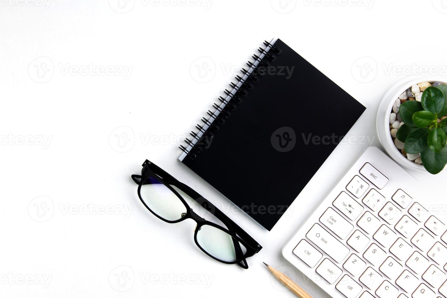 top view of modern white office desk with computer keyboard, blank notebook page and other equipment on white background. Workspace concept, workspace management style, business design space with copy Pro Photo