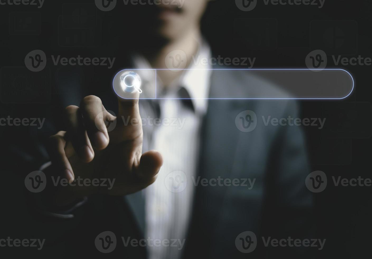 Businessman are touching the virtual screen on search engine optimization for find data on networking, SEO, Searching Browsing Internet Data Information Networking Concept. Pro Photo