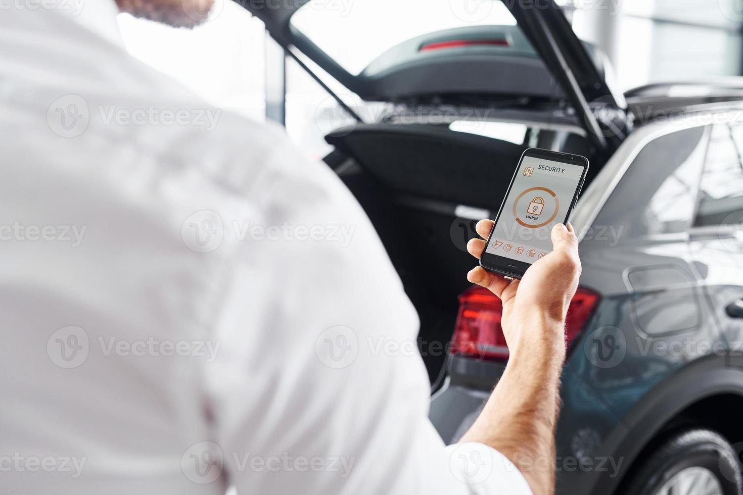 Close up view of man's hand that holds phone with labels and icons. Conception of remote control Pro Photo