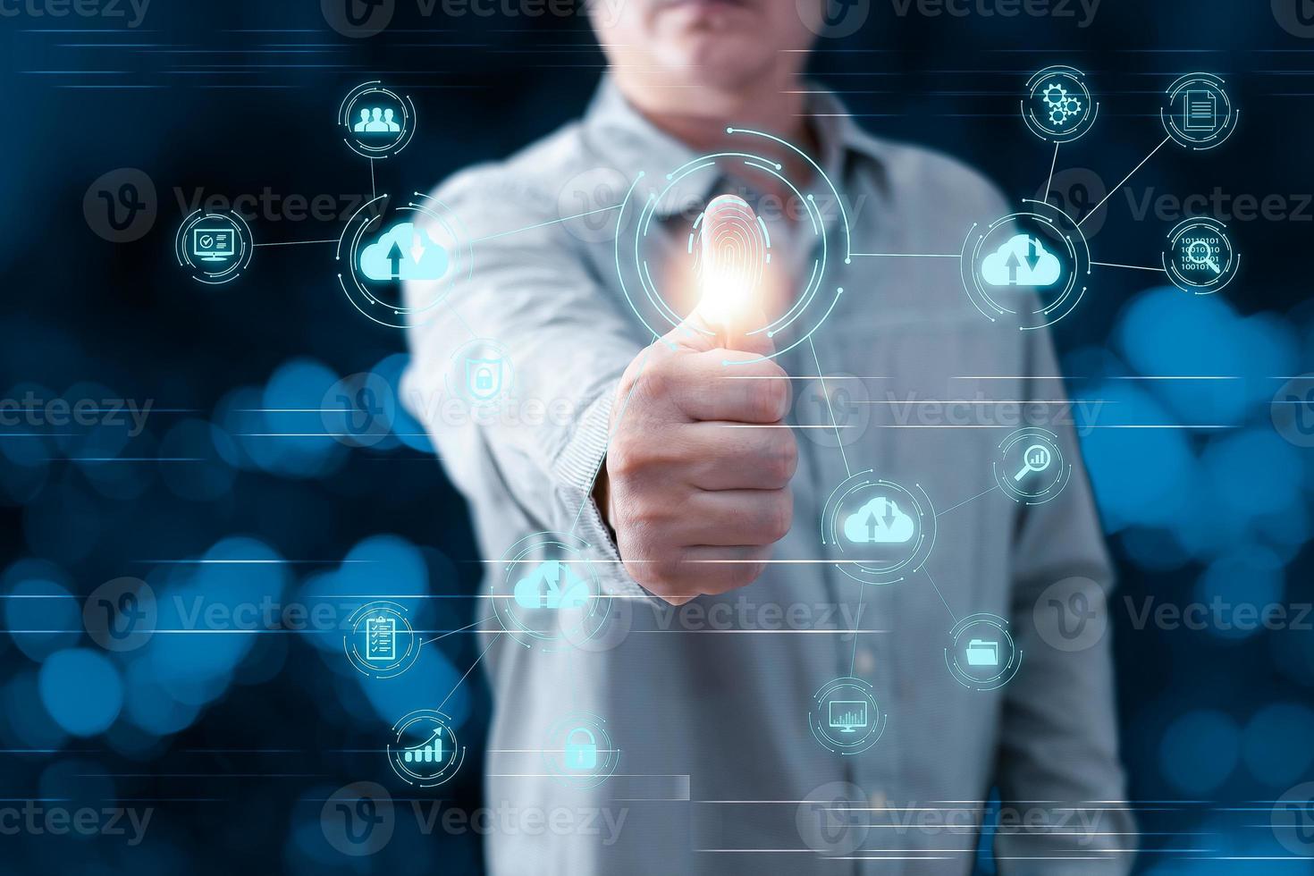 person scan thumbs to access secure data.new technology bigdata and business process strategy,customer service management.Digital transformation change management,internet of things.cloud computing. Pro Photo