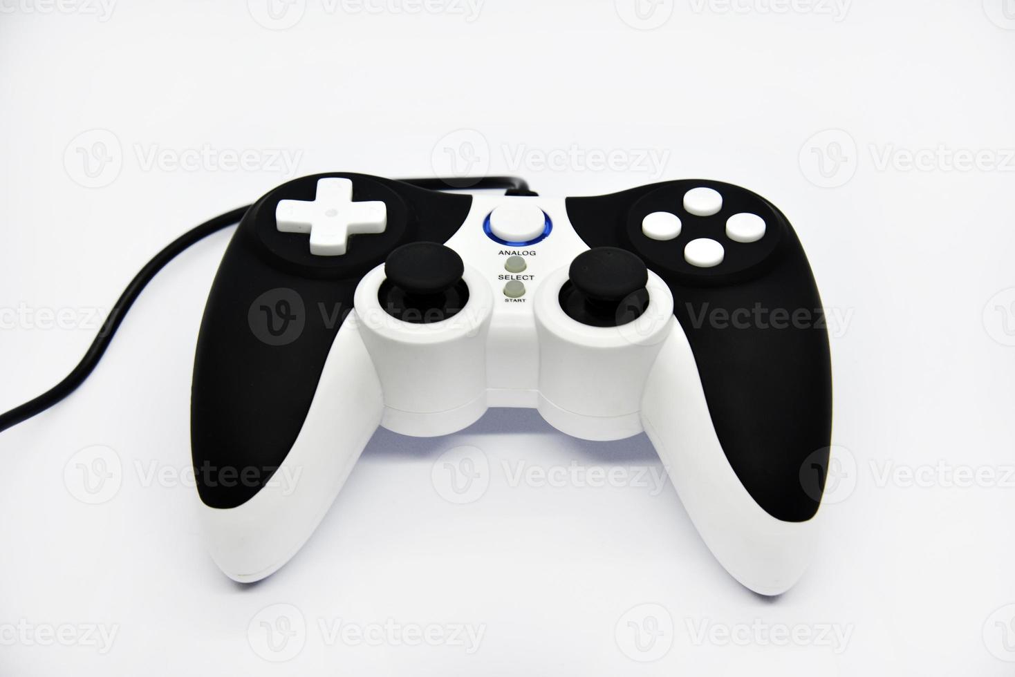 The gamepad is black and white on a white background. Game joystick close-up. A gamepad for a game console. Pro Photo
