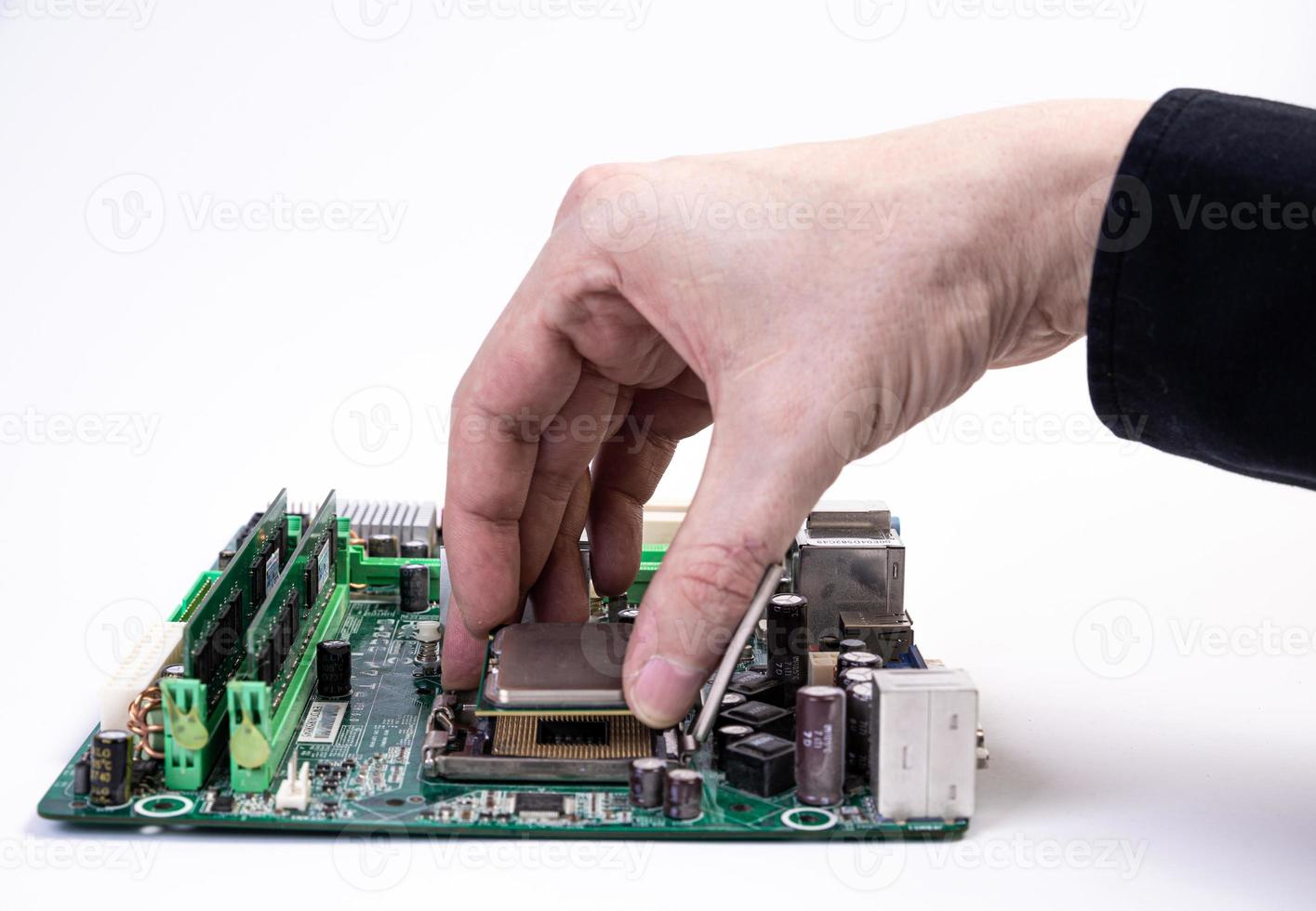 Engineer repairman holding hands in black gloves chip processor, CPU to insert into the socket of the computer motherboard. The concept of technology hardware in the neon light Pro Photo