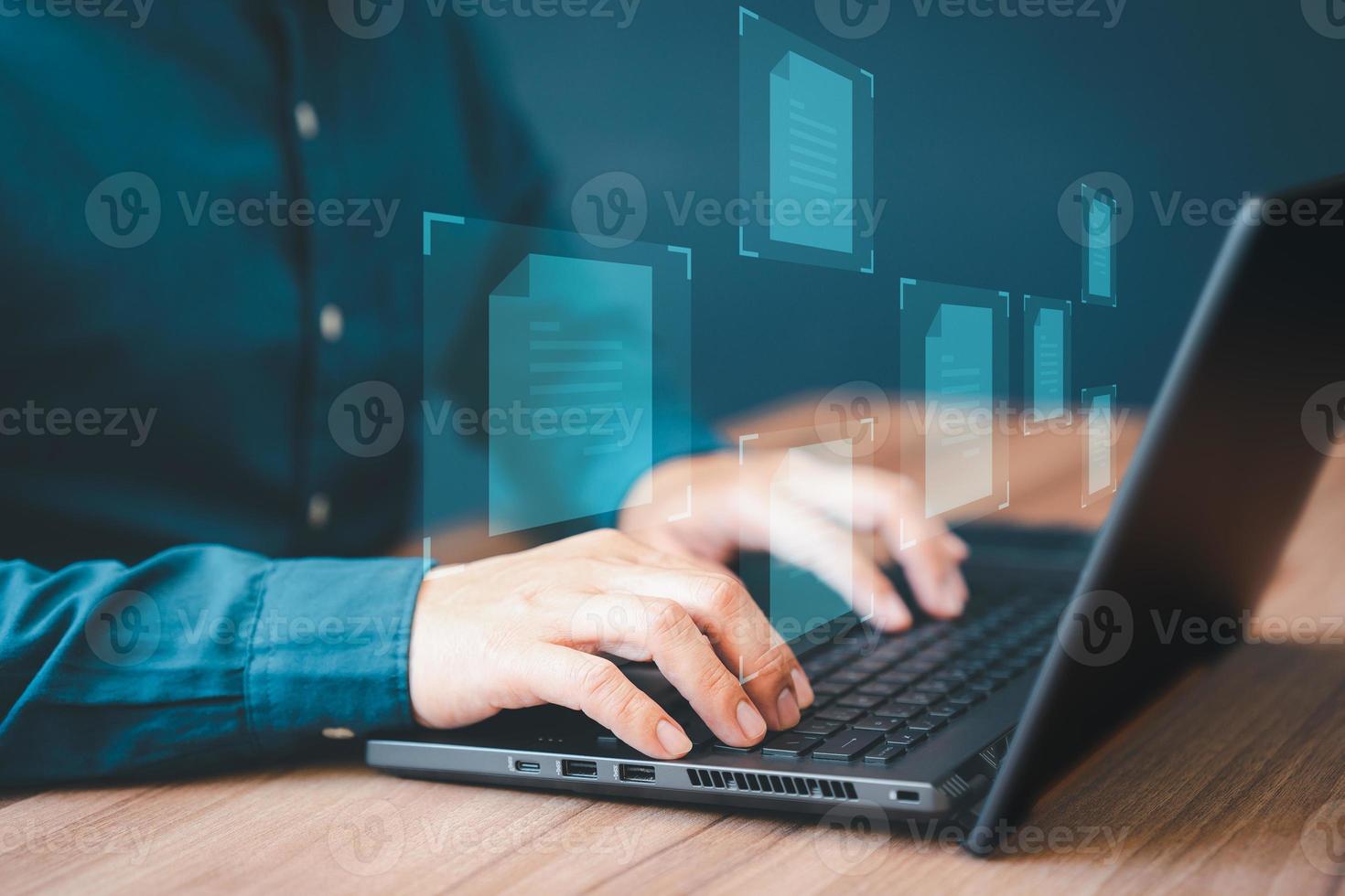 Document Management System, online documentation database and process automation to efficiently manage files. Corporate business technology. Employee man using a computer laptop in office. Pro Photo