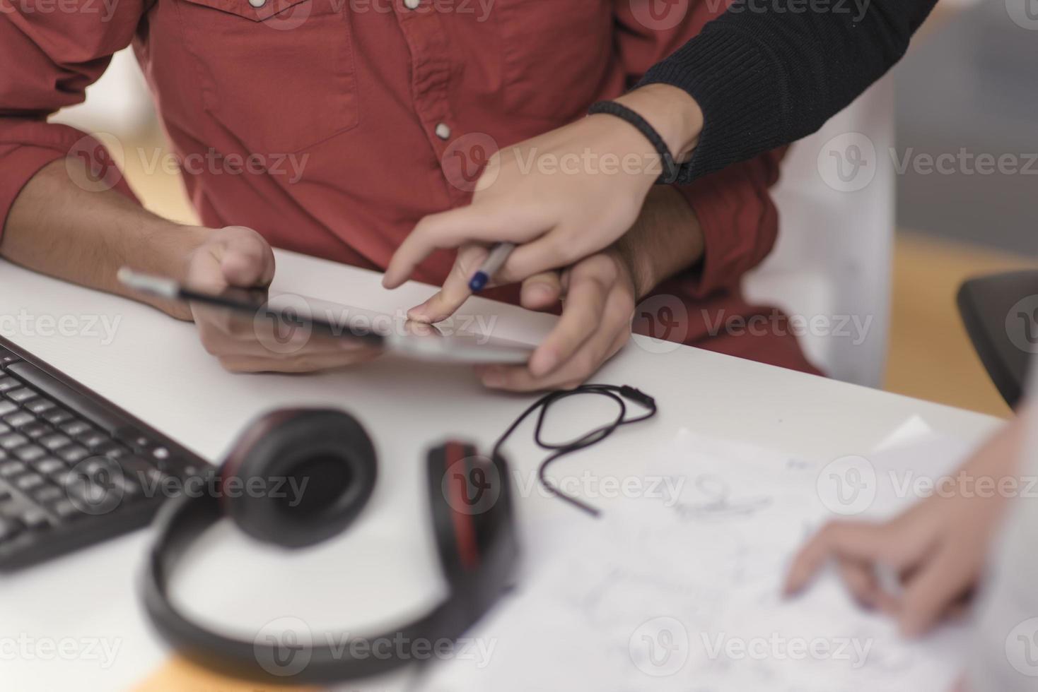 Two partnerships developing programming and coding technologies working on laptop and analyzing together. Pro Photo