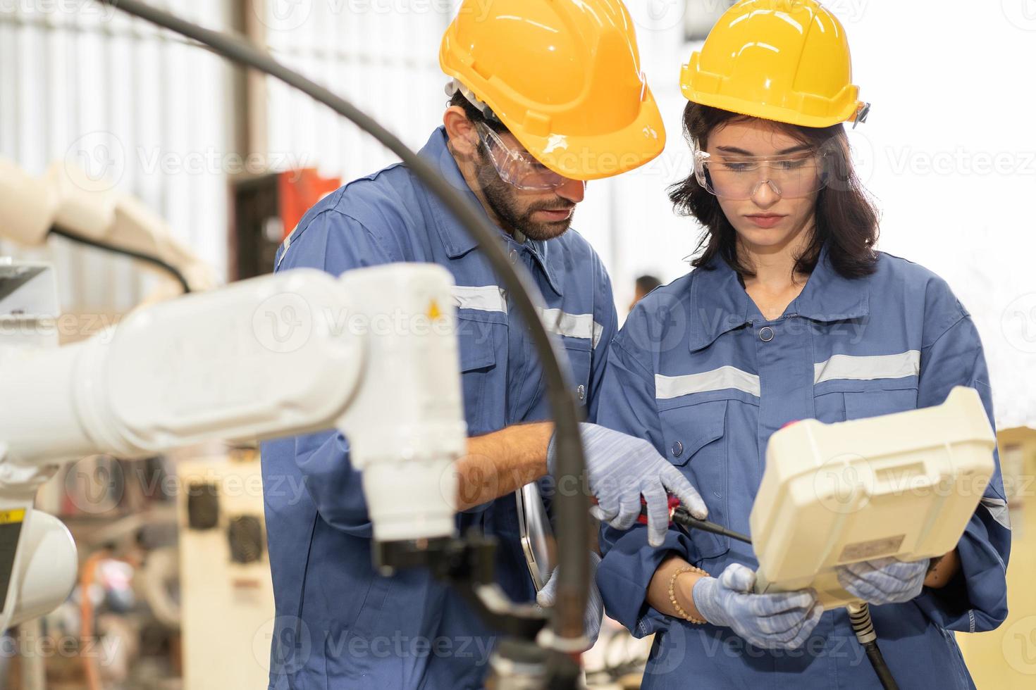 Female industrial engineer using remote control board to check robotic welder operation in modern automation factory. Technician man monitoring robot controller system for automated steel welding. Pro Photo