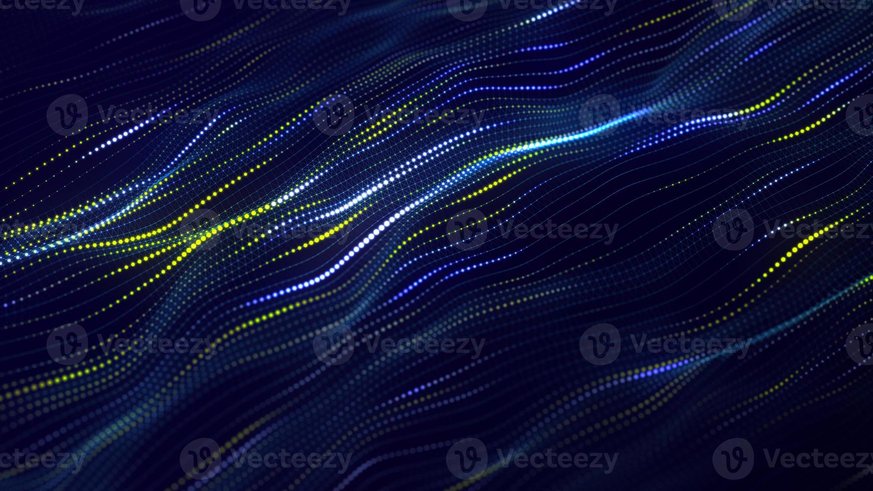 Futuristic glowing wave. The concept of big data. Network connection. Cybernetics and technology. Abstract blue background of moving blue and yellow dots. 3d rendering. Pro Photo