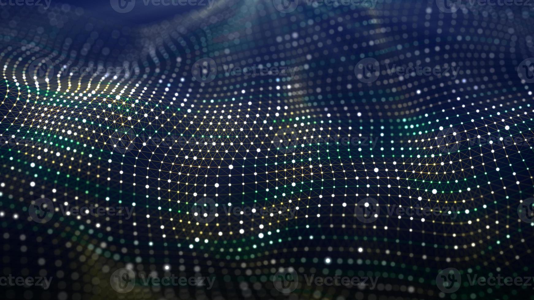 Futuristic glowing wave. The concept of big data. Network connection. Cybernetics. Abstract background of yellow-green grid with white dots. 3d rendering. Pro Photo