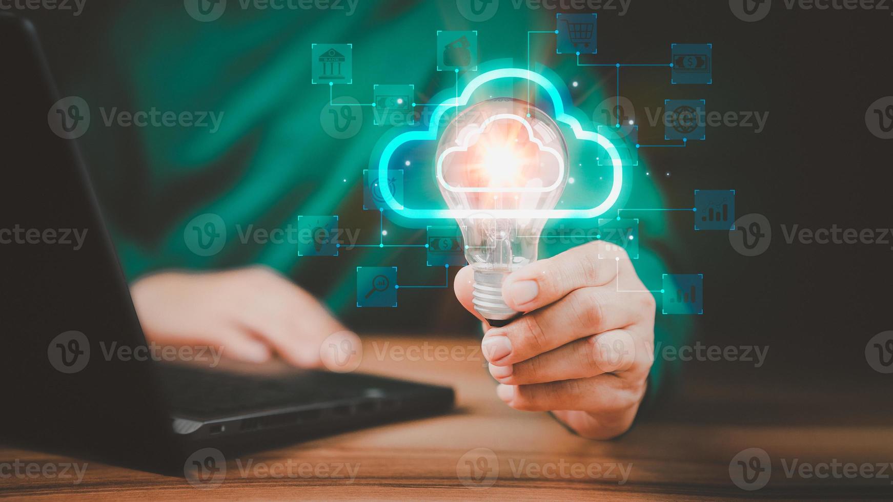 Man holding a light bulb while working on the computer to think and create new ideas. Business global internet connection application technology and digital marketing, Financial and banking. Pro Photo