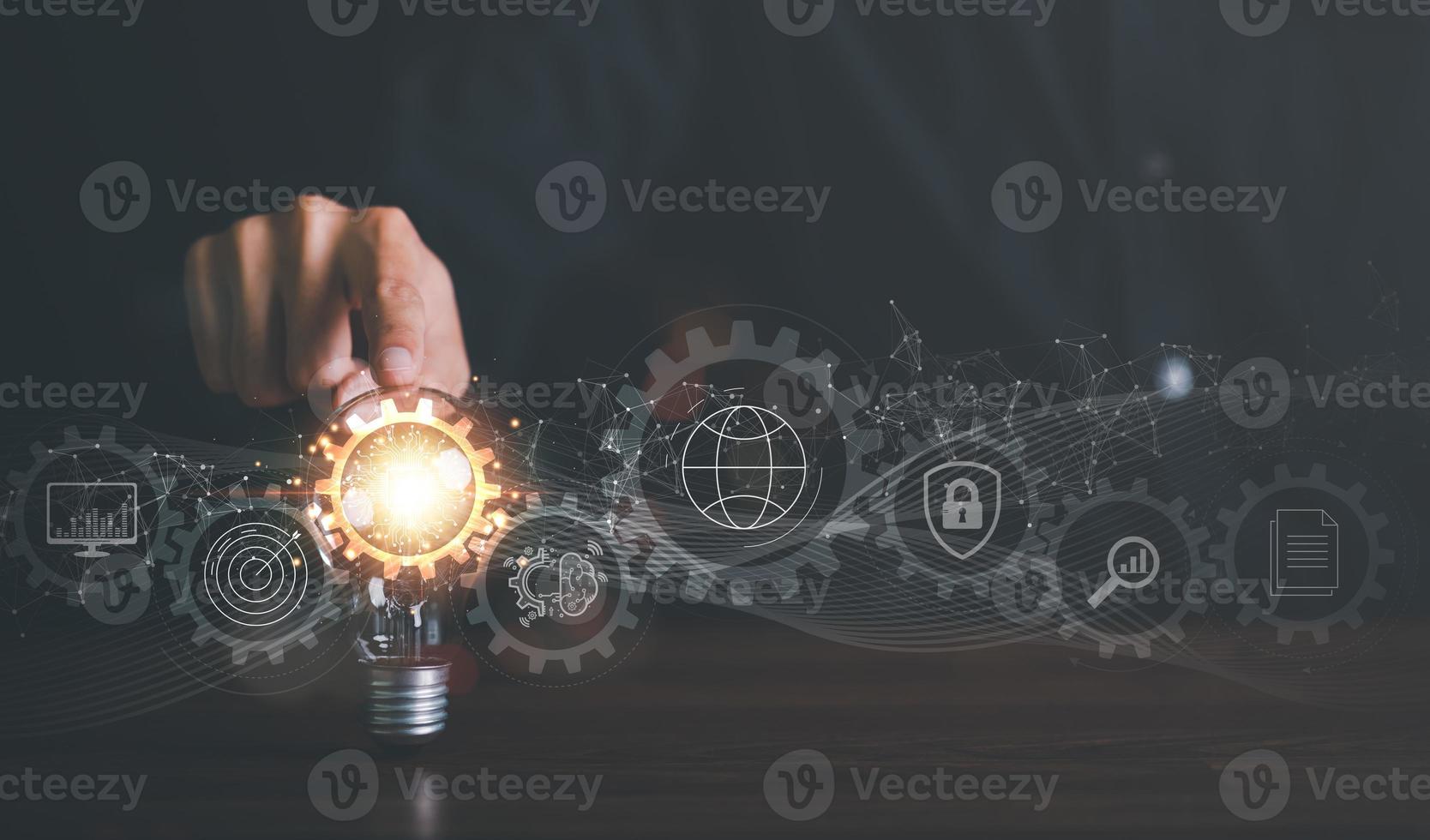 for Concept new idea, concept with innovation and inspiration, innovative technology in science concept and modern business development,creative idea,man pointing light bulb on table Pro Photo