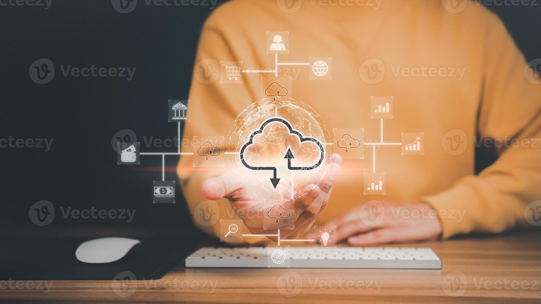 Man working at cloud data icon, cloud computing diagram show on hand. Cloud technology. Data storage. Networking and internet service concept. Pro Photo