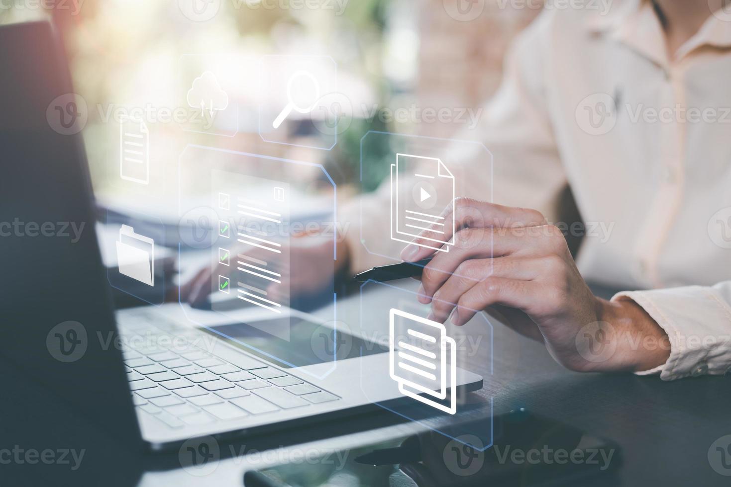 Businessman checking steps through a virtual online document with list of checkboxes ,Document Management Pro Photo