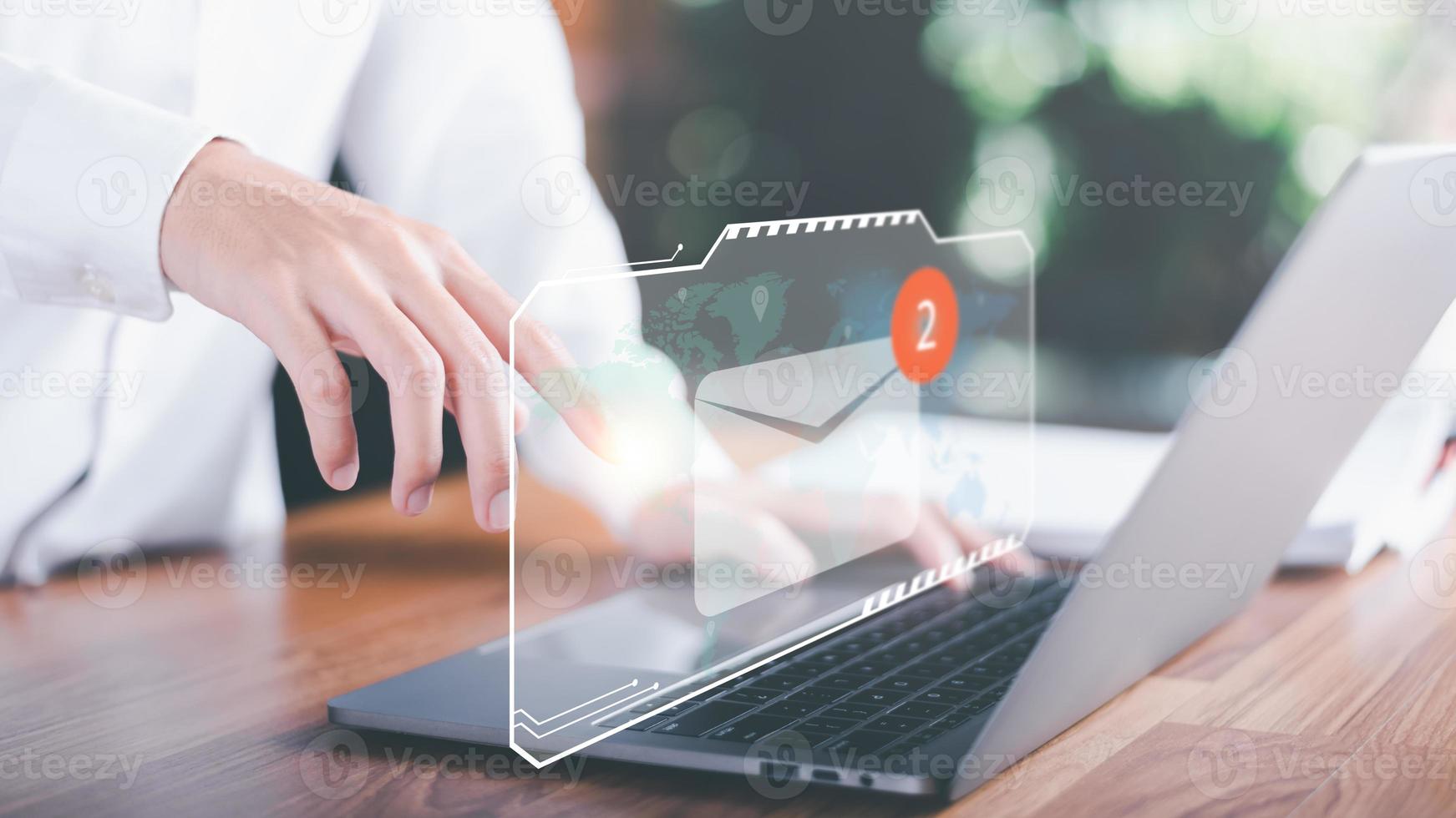man looking at notifications of electronic mail from laptop,Email marketing and newsletter concept,Digital communication with email messages,Sending and receiving messages online with the email icon Pro Photo