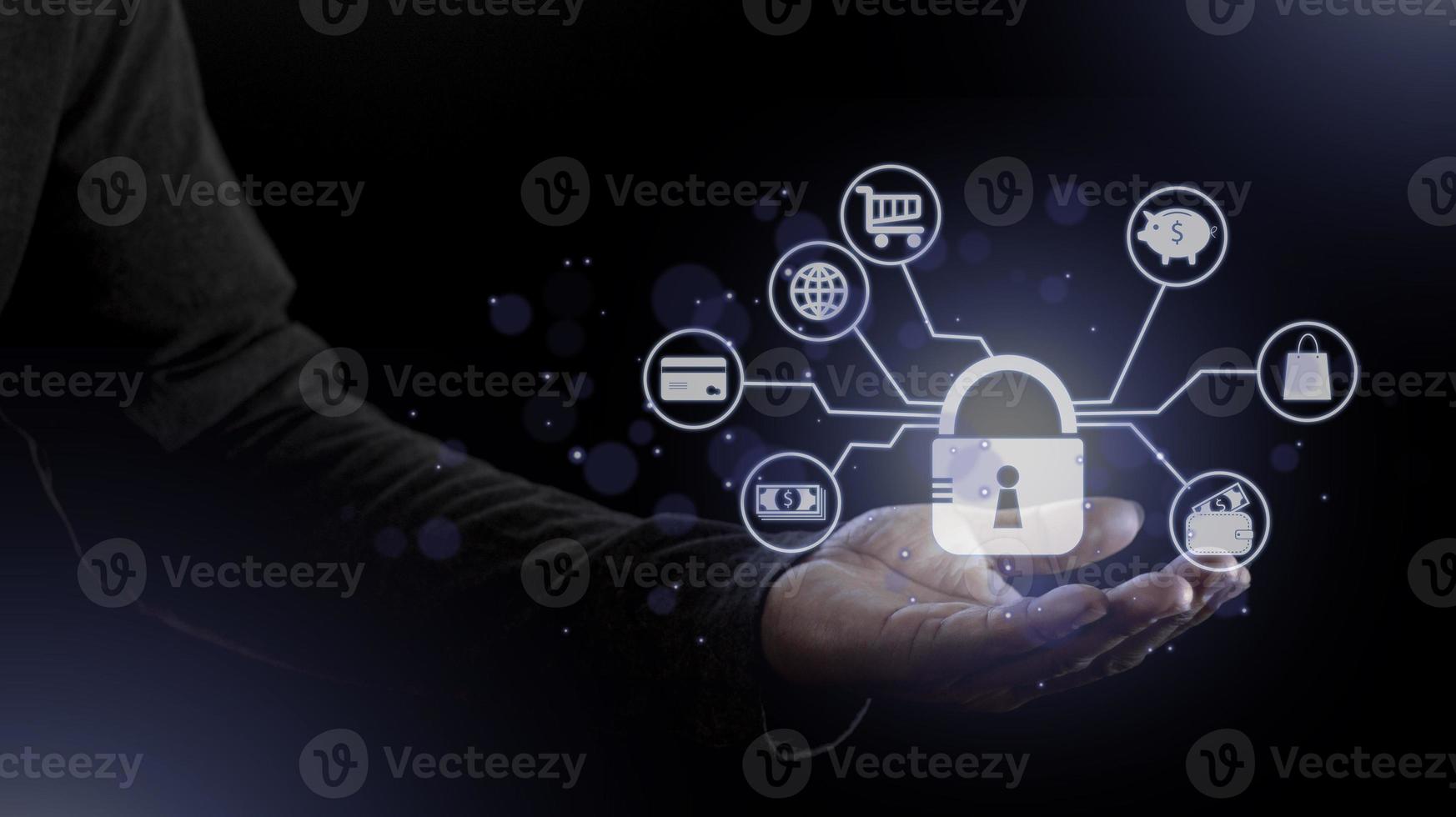 cyber security internet and networking concept. Businessman hand working with VR screen padlock icon on computer background Pro Photo