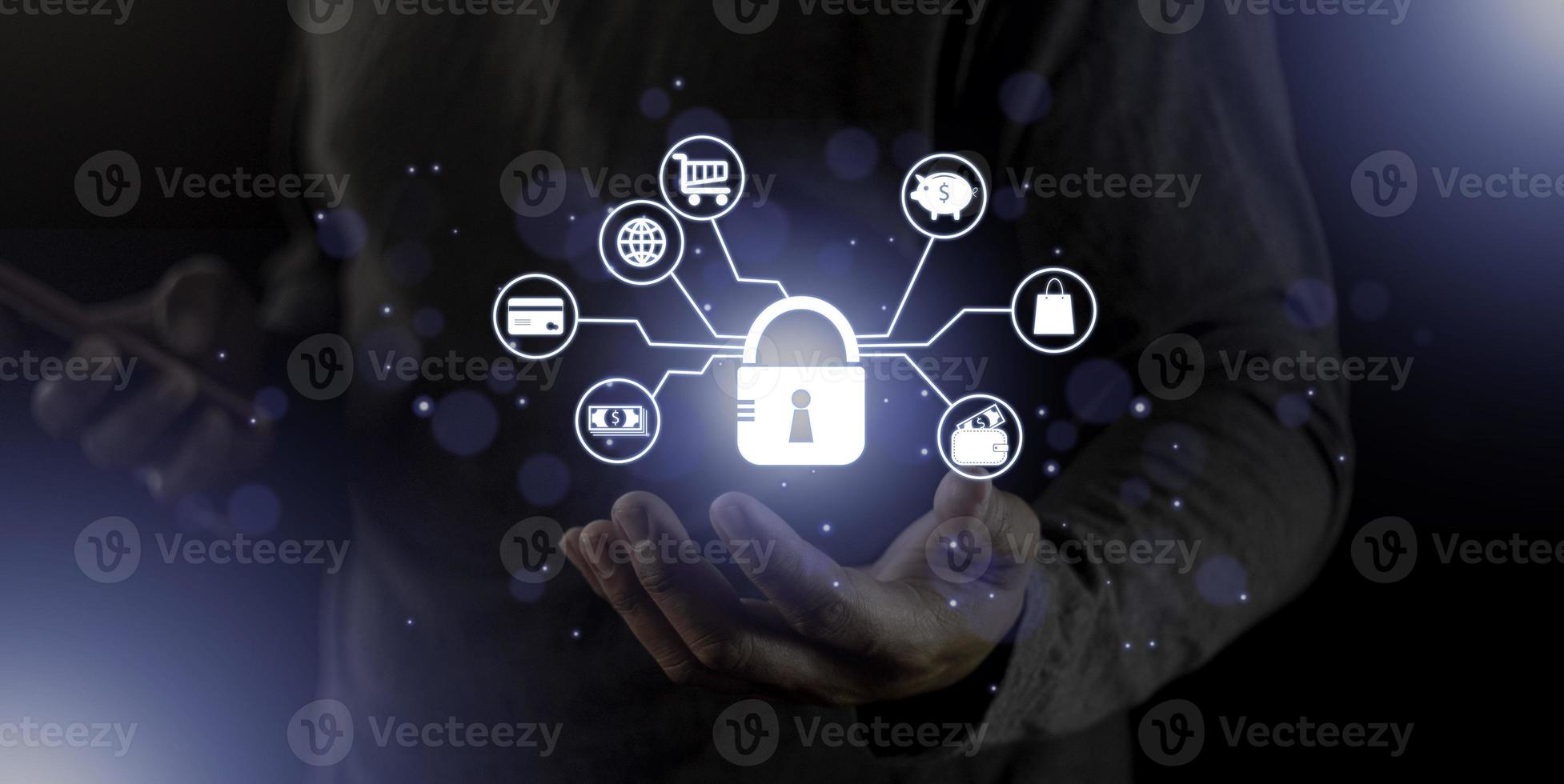 cyber security internet and networking concept. Businessman hand working with VR screen padlock icon on computer background Pro Photo