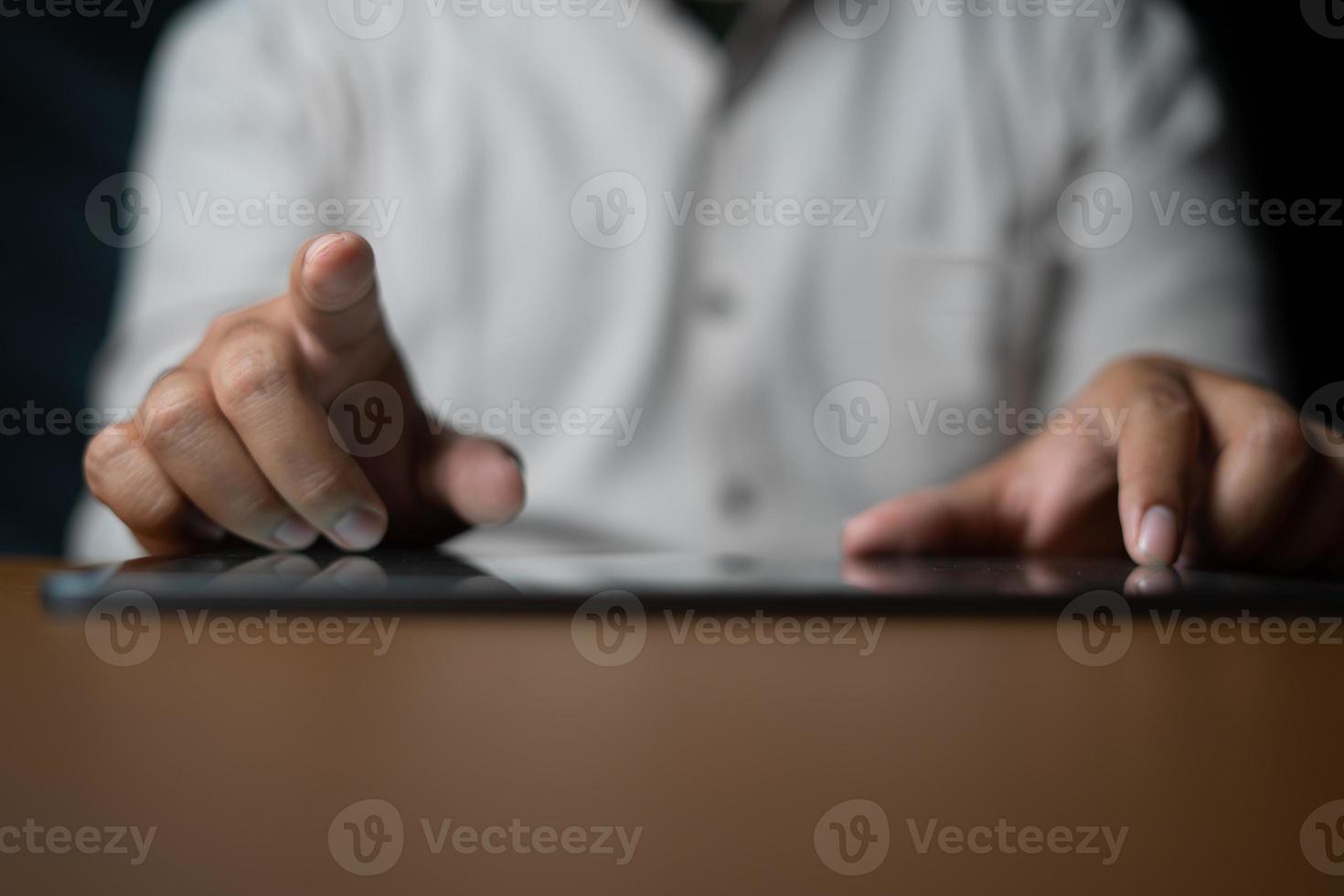 Man holding tablet while pointing to the front. Background of business concepts with digital technology Pro Photo