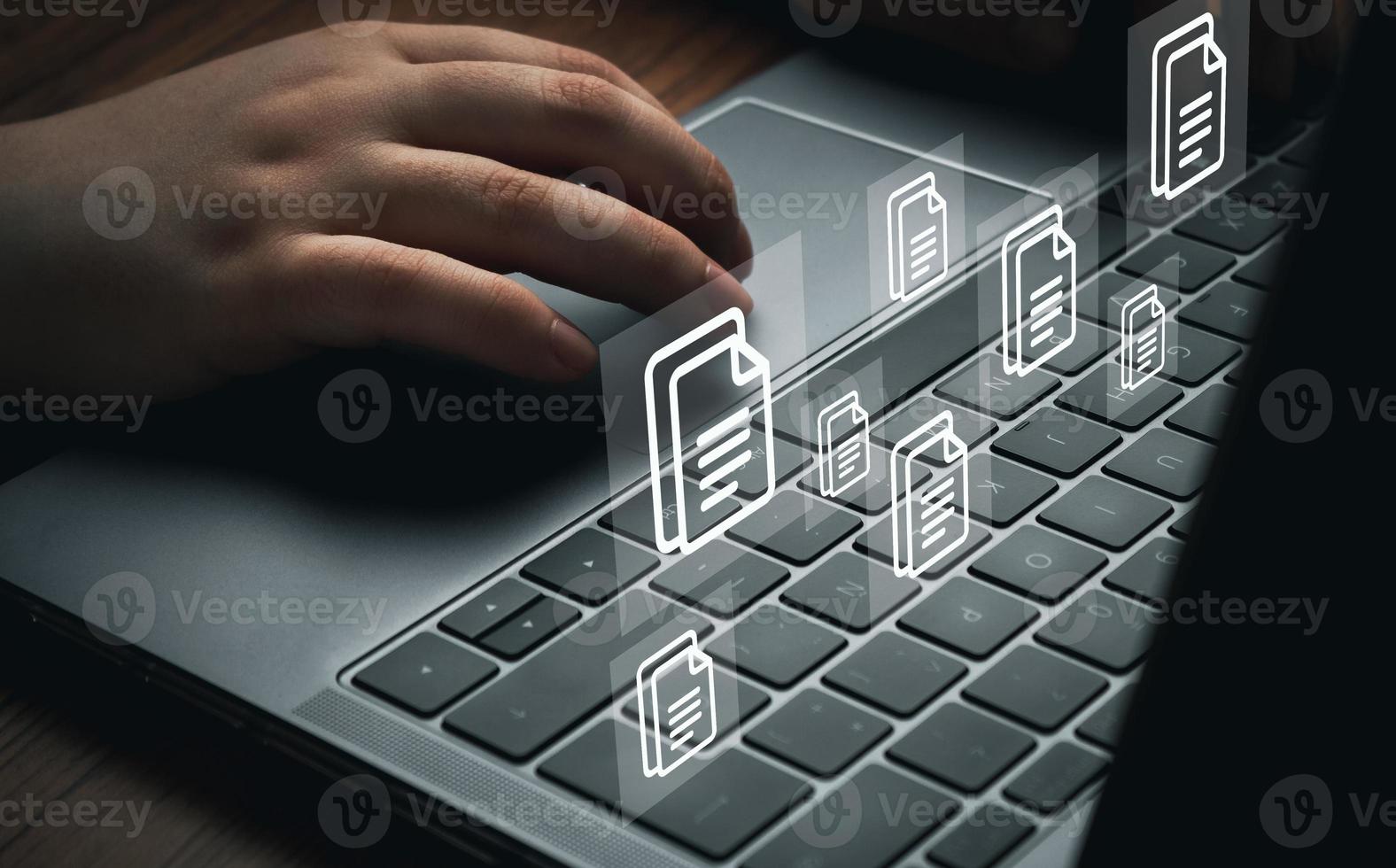 Woman using laptop with VR interface of documents. Document Management System, DMS, concept. Process automation to efficiently manage files. Pro Photo