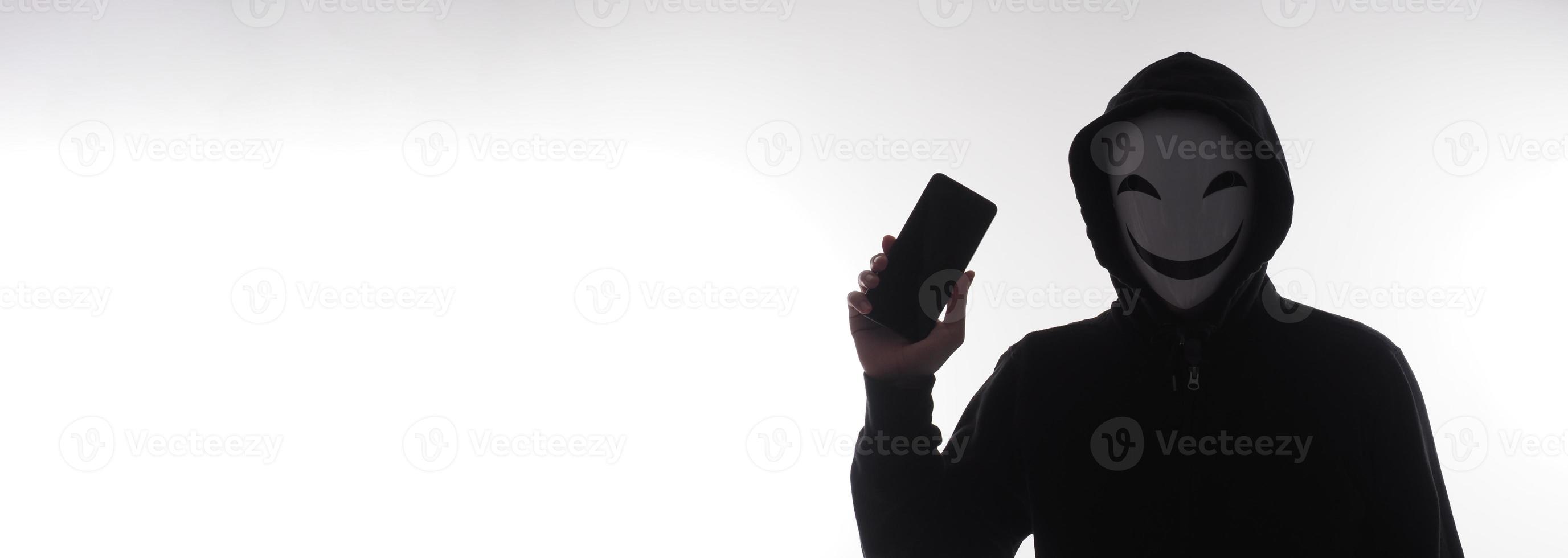 Hacker Anonymous and face mask with smartphone in hand. Man in black hood shirt holding and using mobile phone on white background. Represent cyber crime data hacking or stealing personal data concept Pro Photo